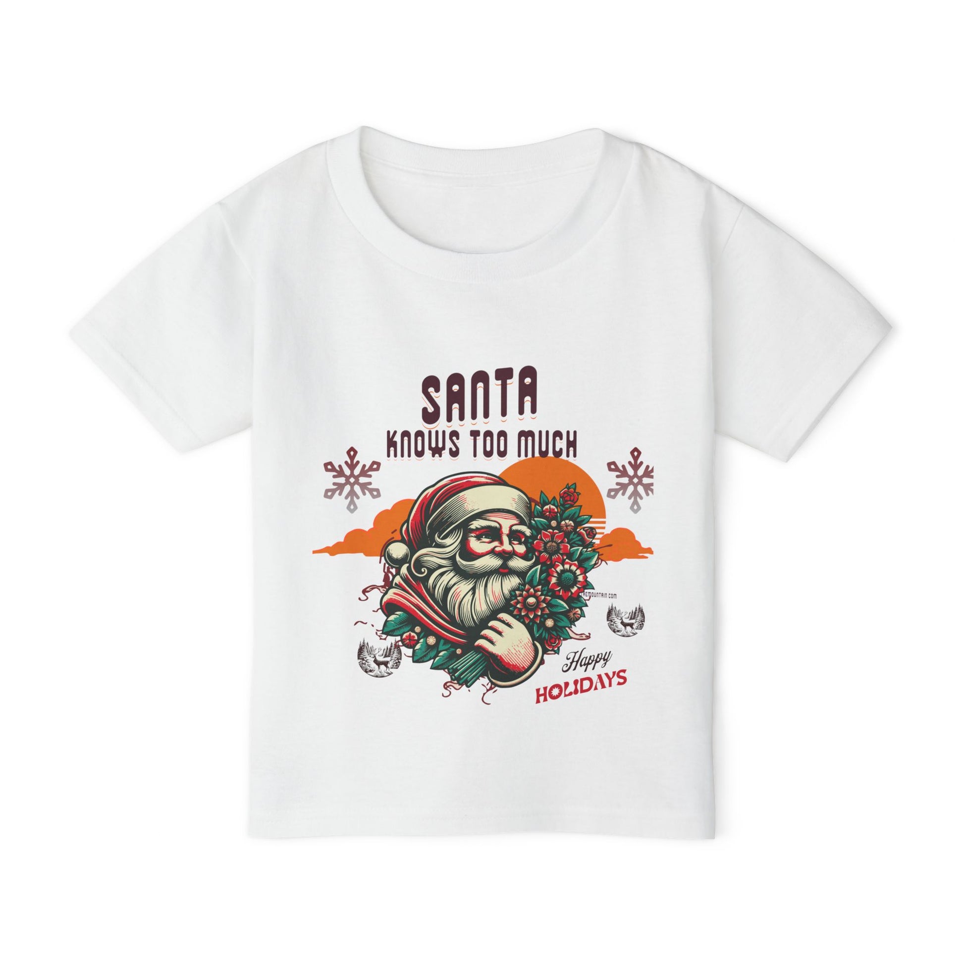 Let this little tee bring a wink of mischief to holiday mornings. A vintage-inspired Santa cradles a bouquet while text reads “Santa knows too much,” blending playful irony with cozy seasonal charm. The medium-weight cotton holds the print’s rich colors and lines, and the classic cut keeps movement easy for busy days of cookie-making, caroling, and family photos. Soft to the touch with a tear-away label, it sits nicely under sweaters or on its own during bright winter afternoons — a shirt that joins in the fun rather than shouting for attention.